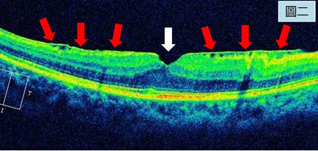 下圖為晚期黃斑前膜病變(紅色箭咀)的掃描圖像,凹位(白色箭咀)因黃斑水腫而消失並開始凸起。